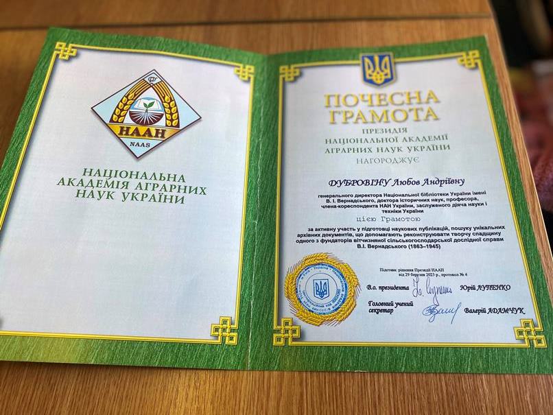На завершення заходу низці учасників були вручені пам’ятні відзнаки й нагороди. За активну участь у підготовці наукових публікацій, пошуку унікальних архівних документів, що допомагають реконструювати творчу спадщину одного з фундаторів вітчизняної сільськогосподарської дослідної справи В. І. Вернадського, Почесною грамотою Національної академії аграрних наук нагороджено генерального директора Національної бібліотеки України імені В. І. Вернадського, члена-кореспондента НАН України Любов Дубровіну, Подякою Національної академії аграрних наук відзначено Андрія Шаповала, Лідії Яременко вручено пам’ятну ювілейну медаль «100 років Національної академії аграрних наук України».