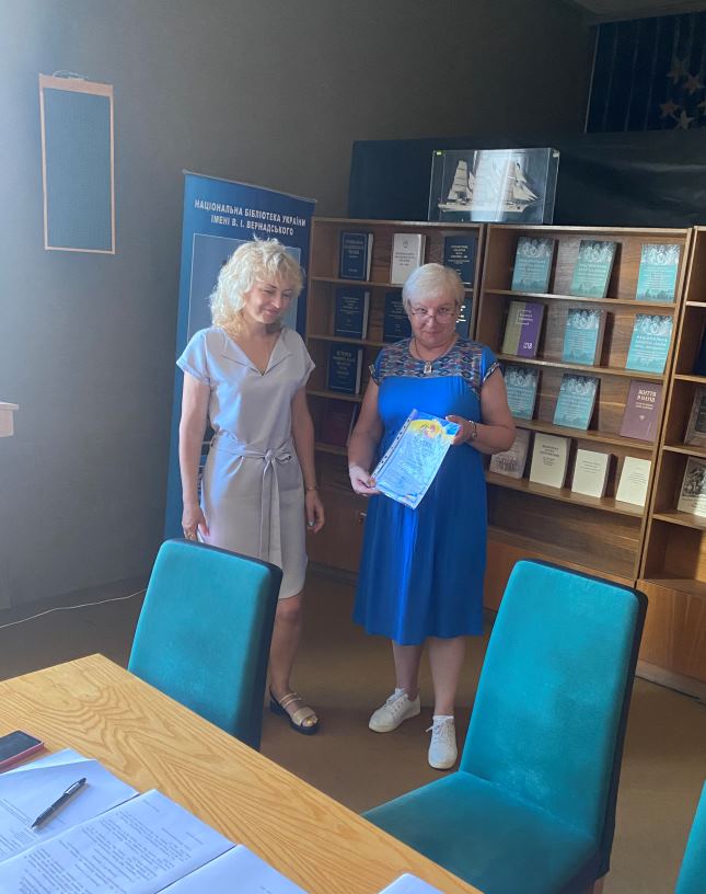 Заступник генерального директора НБУВ Тетяна Миколаївна Коваль з приємністю вручила подяку Національної бібліотеки України імені В.І. Вернадського старшій науковій співробітниці відділу оперативної інформації Служби інформаційно-аналітичного забезпечення НБУВ, кандидатці наук із соціальних комунікацій Оксані Петрівні Желай.
