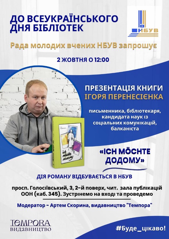 Рада молодих вчених Національної бібліотеки України імені В. І. Вернадського 2 жовтня о 12:00 запрошує на презентацію художньої книги Ігоря Перенесієнка – письменника, бібліотекаря, кандидата наук із соціальних комунікацій, балканіста, наукового співробітника НБУВ до 2023 року