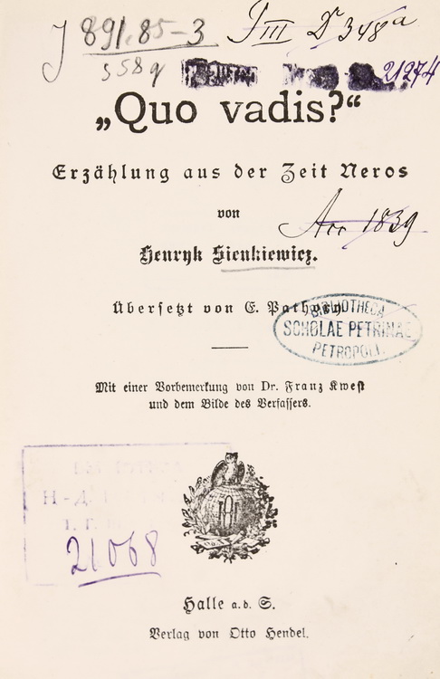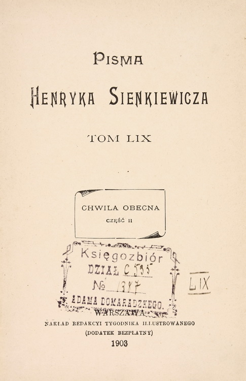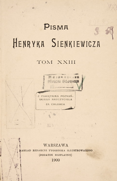 Про популярність творів Сенкевича серед польськомовних українців та поляків у Києві та на Правобережній Україні свідчить польськомовний фонд Всенародної бібліотеки України (1918 р.), сформований з конфіскованих бібліотек шляхти, інтелігенції та навчальних закладів, який нараховує 73 483 одиниці зберігання. Завдяки великій кількості таких бібліотек у відділі бібліотечних зібрань та історичних колекцій НБУВ, було сформовано іноземний сектор де зберігається порівняно велика кількість видань Генрика Сенкевича (бл. 240 примірників), частина з яких має певні ознаки належності до особових бібліотек відомих у минулому постатей. Здебільшого примірники позначені екслібрисами або дарчими написами. У фонді іноземної літератури є видання Г. Сенкевича з штемпелями з особових бібліотек, такими як: «Z księgozbioru Jana Wiszniewskiego», «Własność czytelni Leona Idzikowskiego», «Кsięgozbiór DZIAŁ № 1387 Adama Domaradzkego», «Z księgozbioru Gabryeli Terleckiej Prywitówka», «Zygmunt Slawoszewski», «Wincenty Karpiński», «Kazimierz Mośtowski» та ін. На деяких з них присутні печатки різних наукових установ, наприклад: «Bibliotheca Scholae Petrinae Petropoli», «Instytut Polskiej Kultury Proletarjackiej Bibljotek». Велика кількість видань Г. Сенкевича є в історичному зібранні бібліотеки університету св. Володимира та інших навчальних закладах.