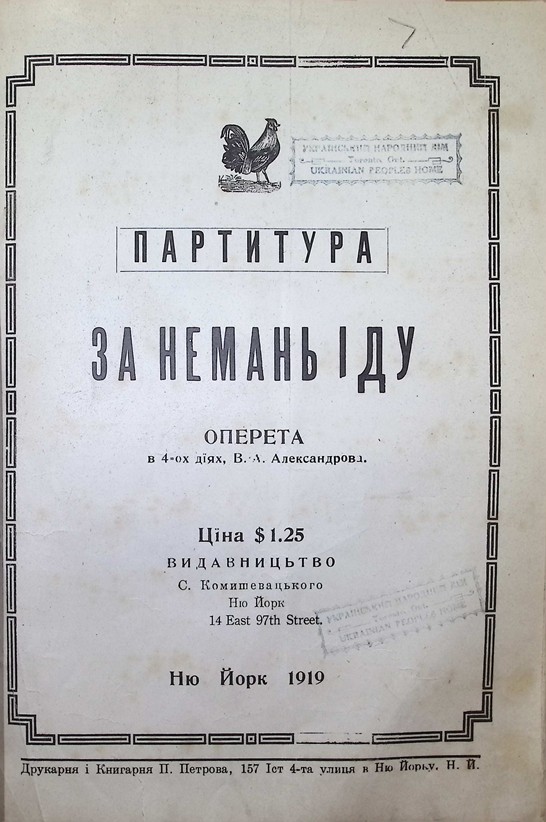 У відділі музичних фондів зберігаються дві оперети В. Александрова «За Немань іду» та «Ой не ходи Грицю та на вечорниці». Вочевидь, що твори надруковано вже за редакцією М. Старицького. Публікацію двох оперет здійснено у Нью-Йорку 1919 року, у видавництві С. Комишовацького, у друкарні П. Петрова. Слід звернути увагу, що на титульному аркуші оперети «За Немань іду» зазначено, що це твір В. Александрова (іл. 10), а на титульному аркуші оперети «Ой не ходи Грицю та на вечорниці» вказано, що це драма М. Старицького (іл. 11). Вочевидь, це помилка видавців, позаяк відомо, що М. Старицький вже після смерті В. Александрова вніс певні зміни до його оперет, трансформувавши їх у драму.