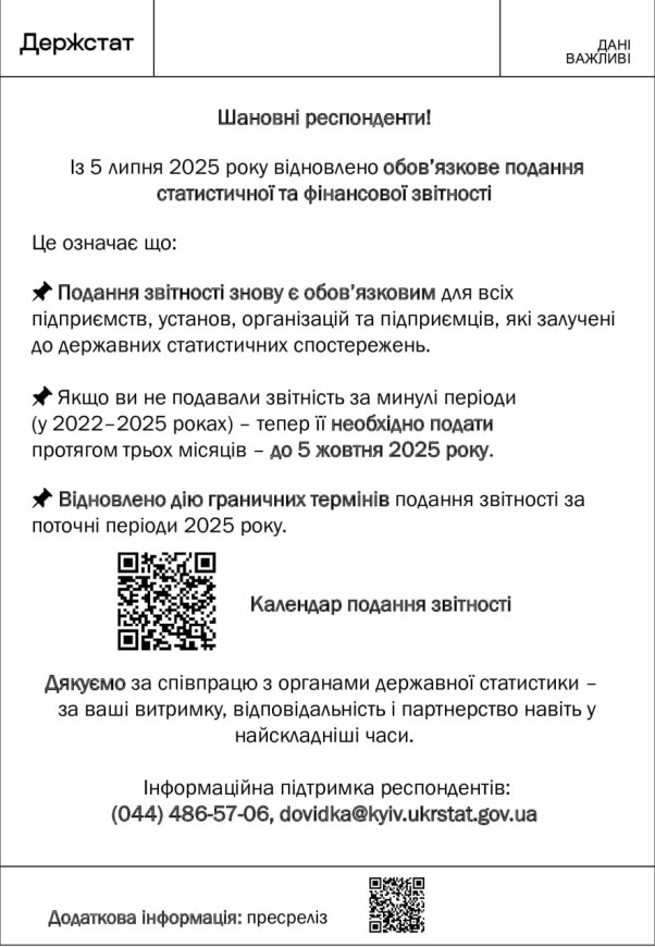 «Відновлення звітування – стратегічно важливий крок для України. Прийняття змін до закону дозволить Держстату збирати повні дані та забезпечити якісну офіційну статистику. Це також важливо для виконання євроінтеграційних зобов’язань, зокрема передачі даних до Євростату. Дані, зібрані та оброблені Держстатом, стануть основою для формування ефективних державних політик, орієнтованих на відновлення країни, економіки, соціальної сфери. Це також означає поступове повернення до довоєнного рівня обсягу даних і повноцінне відновлення нашої роботи, яка була обмежена через війну», — зазначив Голова Державної служби статистики України Арсен Макарчук.