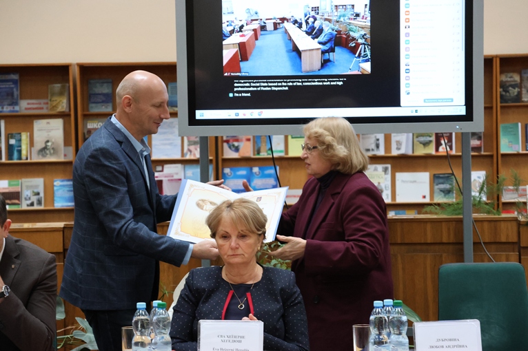 Дипломатка з питань культури та освіти Посольства Угорщини в Києві Єва Хеїзерне Хегедюш привітала учасників такої значимої конференції й підкреслила необхідність постійного підвищення ролі культури та цивілізаційних досягнень у міжнародних відносинах, що є загальновизнаним явищем сьогодення. У сфері культурної дипломатії все більшу роль відіграє багатостороннє міжнародне середовище. Інструментарій культурної дипломатії розширюється, одним із традиційних ефективних засобів є налагодження обмінних зв’язків з освітньою та культурною метою. Мережа бібліотек також належить до організаційної інфраструктури, необхідної для управління програмами міжнародних культурних відносин, адже бібліотеки є не тільки культурними центрами, а й відіграють визначальну роль у зміцненні культурних дипломатичних відносин між народами. Вона відзначила, що офіційний візит генерального директора Національної бібліотеки Угорщини імені Ференца Сечені до НБУВ в лютому цього року відкрив нову сторінку в угорсько-українській міжбібліотечній співпраці, яку угорська сторона високо цінує. Вона також передала Любові Дубровіній вітання з ювілеєм від Посольства Угорщини.