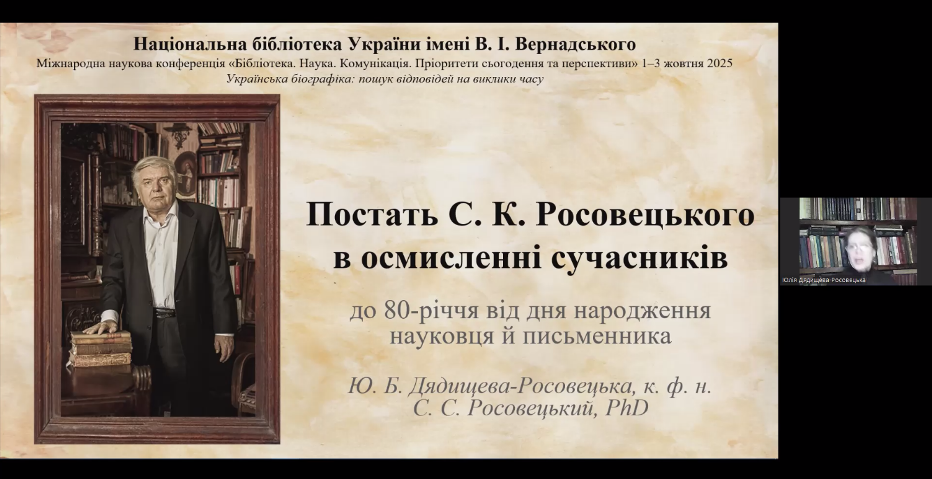 Представлена тема «Постать С.К. Росовецького в осмисленні сучасників (до 80-річчя від дня народження науковця й письменника)» у співавторстві Юлії Дядищевої-Росовецької, доцентки Навчально-наукового інституту філології Київського національного університету імені Тараса Шевченка, і Станіслава Росовецького, незалежного дослідника, презентувала всебічне висвітлення постаті видатного вченого й талановитого письменника в колективній монографії «Станіслав Росовецький: In memoriam» (2023). Пані Юлія під час дискусії презентувала й подарувала книгу Станіслава Росовецького «Володимир Перетц: біографія інтелектуала» (2023) пані Тетяні Вірченко для подальших студіювань інтелектуальної біографії.