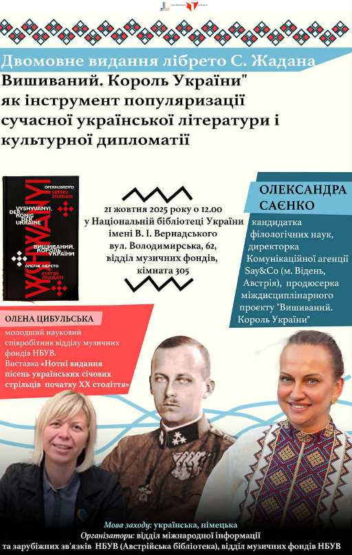 21 жовтня 2025 року о 12.00 у Національній бібліотеці України імені В. І. Вернадського (НБУВ, вул. Володимирська, 62, відділ музичних фондів, кімната 305) відбудеться презентація "Двомовне видання лібрето С. Жадана "Вишиваний. Король України" як інструмент популяризації сучасної української літератури і культурної дипломатії".