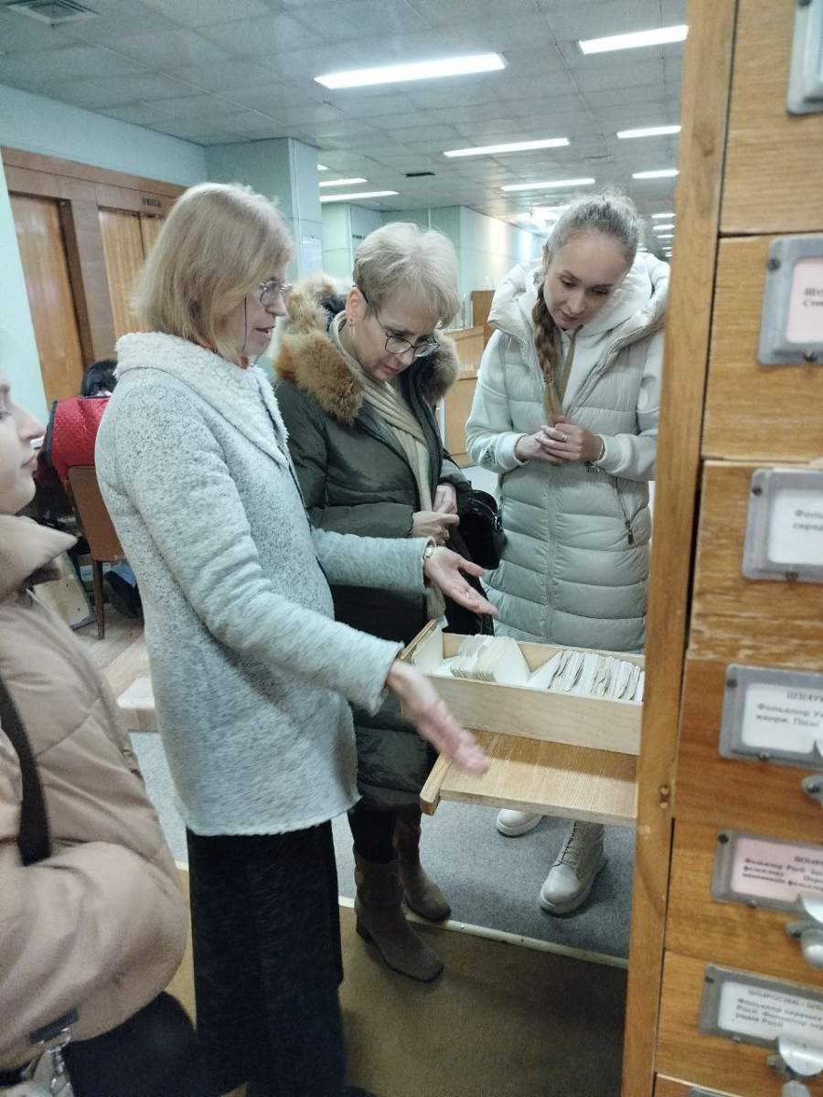 Оглядову екскурсію установою провела Віра Георгіївна Твердохліб (Фонд президентів України НБУВ). Скондесовано висвітливши історію Бібліотеки, вона розкрила цікаві деталі про монументальне панно «Біль землі» та гобелен «Витоки слов’янської писемності». Далі очільниця відділу каталогів Юлія Леонідівна Фіх ознайомила гостей із загальними принципами пошуку в картковому каталозі та допомогла з кожним окремим запитом. Відвідали залу довідкових видань, відділ підсобного фонду, виставку нових надходжень. Багато уваги приділили теорії та практиці пошуку через електронні ресурси НБУВ під керівництвом Дмитра Олександровича Ушеренка, молодшого наукового співробітника відділу комплексного бібліотечного обслуговування. А ще шукали сліди китайської бібліотеки та з’ясовували долю її фондів. Також детально познайомилися із фондом відділу закордонної періодики, намагаючись знайти нові китайські та іспанські журнали. Проте, враховуючи спорадичність комплектування іноземними виданнями, з якою змушена миритися бібліотека, цього досягти не вдалося.