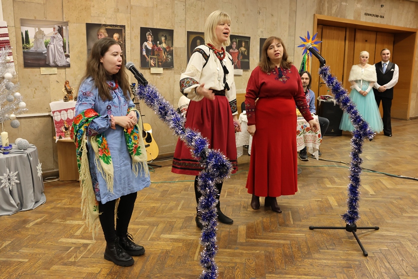 Але не лише веселий настрій панував у холі конференц-зали, святково прикрашеному руками наших колег-ентузіастів. Подячно вклонилися присутні всім захисникам і захисницям України, вшанували пам’ять полеглих воїнів, серед яких, на жаль, є й працівник НБУВ Артем Торопов… Тож, крім всесвітньо відомого «Щедрика» й колядок, прозвучали й пісні про Бахмут, про вірність своїй землі та звитяжність її захисників.