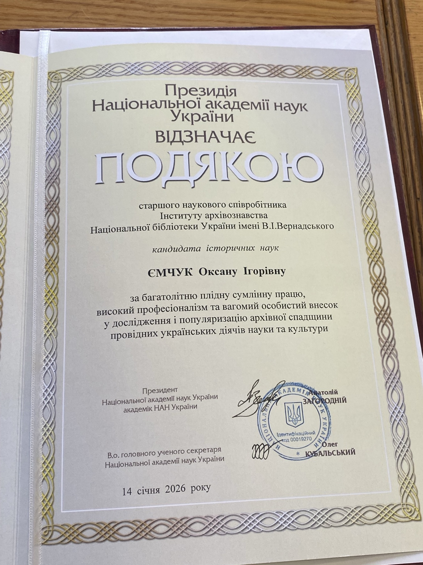 Ще однією Подякою Президії НАНУ відзначено старшого наукового співробітника Інституту архівознавства НБУВ Оксану Ігорівну Ємчук.