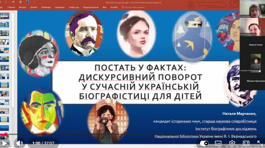 На секційних засіданнях виступили з доповідями співробітники Інституту біографічних досліджень НБУВ: кандидат історичних наук Наталія Петрівна Марченко – «Постать у фактах: дискурсивний поворот у сучасній українській біографістиці для дітей», кандидат історичних наук Вікторія Василівна Патик – «Інтеграція української біографістики до світової спадщини», кандидат філологічних наук, доцент Оксана Валентинівна Плющик – «Цифровий слід письменника: проблема верифікації біографічних джерел у онлайн-просторі» та молодші наукові співробітниці Тетяна Володимирівна Котлярова і Тетяна Вікторівна Комарянська – «Колективний портрет представників Харківської школи романтиків: ресурс Українського національного біографічного архіву».